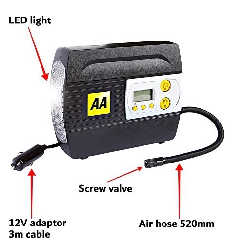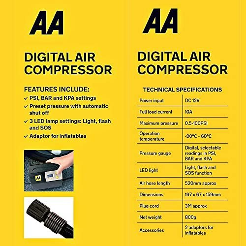 Be the first to review “AA 12V Digital Tyre Inflator AA5502 – For Cars Other Vehicles Inflatables Bicycles – Shows PSI BAR KPA 3-100 PSI – Includes Adaptors, Black”
