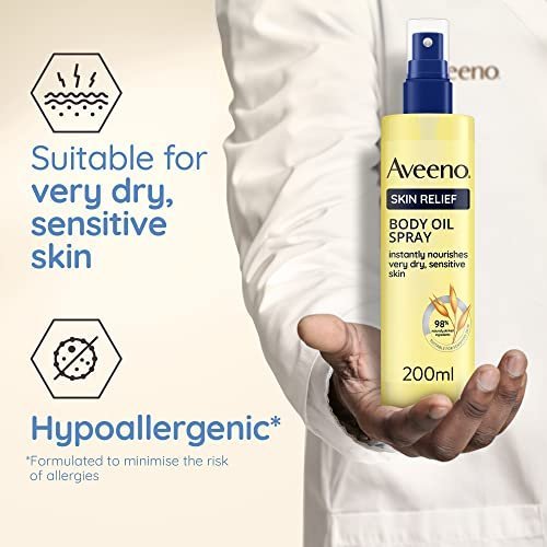 • Product details: Aveeno Skin Relief Body Oil Spray (1x 200ml), oil spray for nourishing and relieving dry, sensitive skin, full-body moisturising oil with Jojoba and Oat Oil extracts