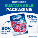 Bloo Power Active Toilet Rim Block was the first of its kind – an innovative rim block which combines design and function in one Every ball is loaded with a perfumed core that has 40% more fragrance freshness vs the outer shell, giving a boost of fresh flowers fragrance from the first to the last flush. A hygienically clean and fresh toilet with every flush! This pack contains 3 x rimblocks, each toilet block lasts up to 240 flushes