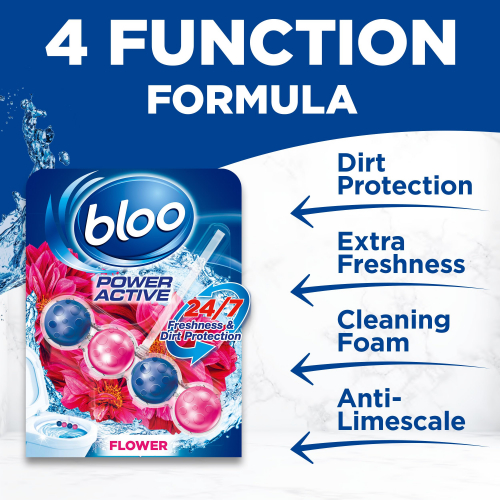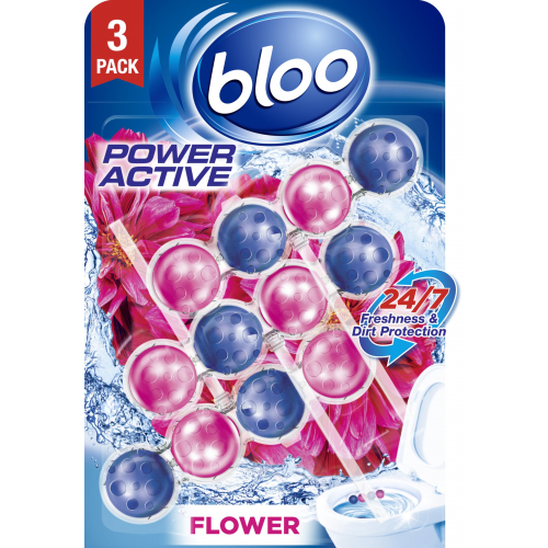 Bloo Power Active Toilet Rim Block was the first of its kind – an innovative rim block which combines design and function in one Every ball is loaded with a perfumed core that has 40% more fragrance freshness vs the outer shell, giving a boost of fresh flowers fragrance from the first to the last flush. A hygienically clean and fresh toilet with every flush! This pack contains 3 x rimblocks, each toilet block lasts up to 240 flushes