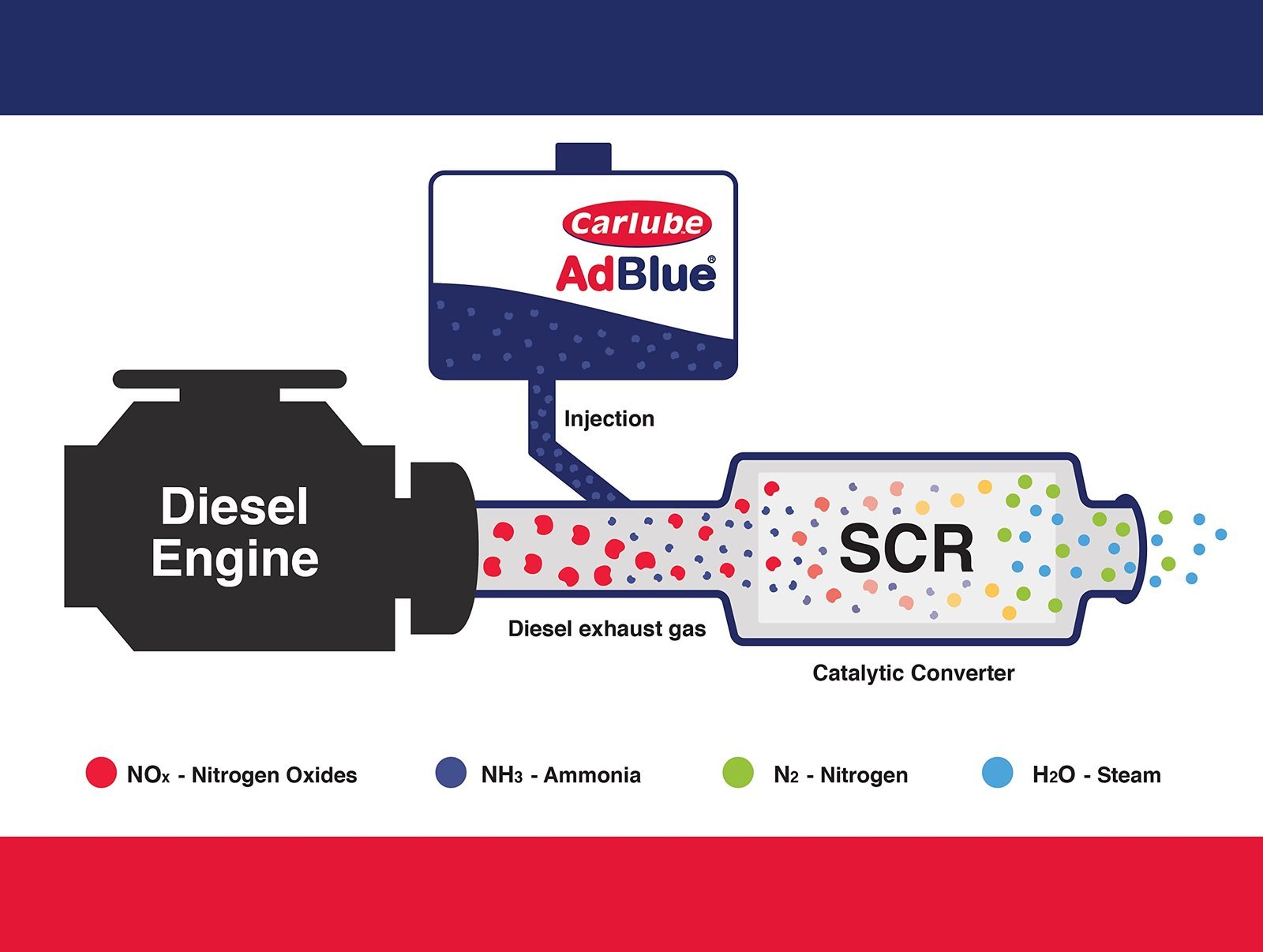 - Adblue contains a 32.5% solution of urea in deionised water which is injected into the exhaust stream to break down harmful nitrogen oxides (NOx) into harmless nitrogen and water vapour.