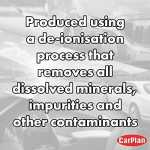 - Produced using a de-ionisation process that removes all dissolved minerals, impurities and other contaminants