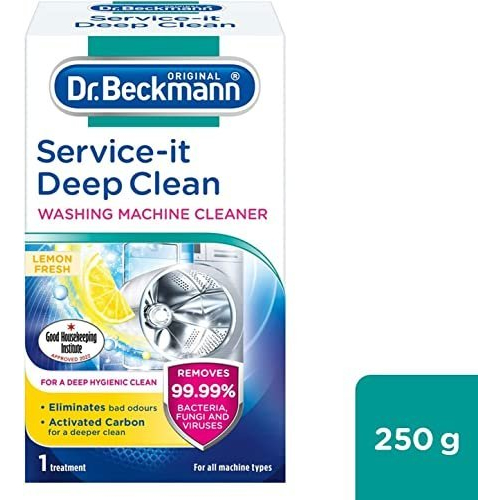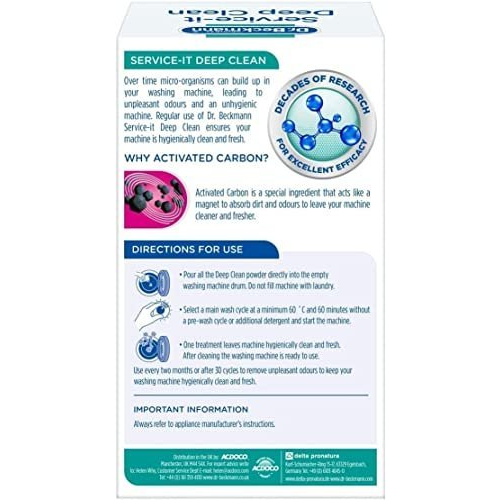 Dr. Beckmann service-it deep clean washing machine cleaner powder not only cleanses your machine but also kills 99.99 % of bacteria, viruses and fungi, leaving your washing machine hygienically clean and smelling fresh. Every time you wash deposits of dirt and detergent settle in your washing machine. This causes unpleasent damp smells and often mould on door seals and in detergent drawers. It is important to hygenically clean the the machine which helps you clean!
