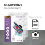 The pouch you use can change the finished result, so it is important that you select the laminating sheets that are suited to your specific application – a gloss finish creates an extremley versatile, high quality look which is ideal for most laminating jobs. It is also good to know that the quality of the laminator pouches you use will influence the quality of the finished result and could have an impact on the future performance of your laminating machine. In addition to becoming instantly more durable and robust, a newly laminated document provides a quality, professional looking finish. Lamination protects documents from damage by fingerprints, smudges and ripping and also enhances the colours and contrast of the print, keeping materials in like-new condition for many years. Laminated paper or card can be used for presentation or signage purposes, as well as preserving frequently accessed and important documents. Using a Fellowes laminator will preserve and protect your documents and important papers from everyday wear and tear. The unique ImageLast directional quality mark disappears after lamination and ensures your laminating pouches are inserted correctly into your laminator. Enhance 80 Micron (2 x 80 Micron) laminating pouches A4 are perfect for use at home or in the office and are compatible with all popular brands of laminator.