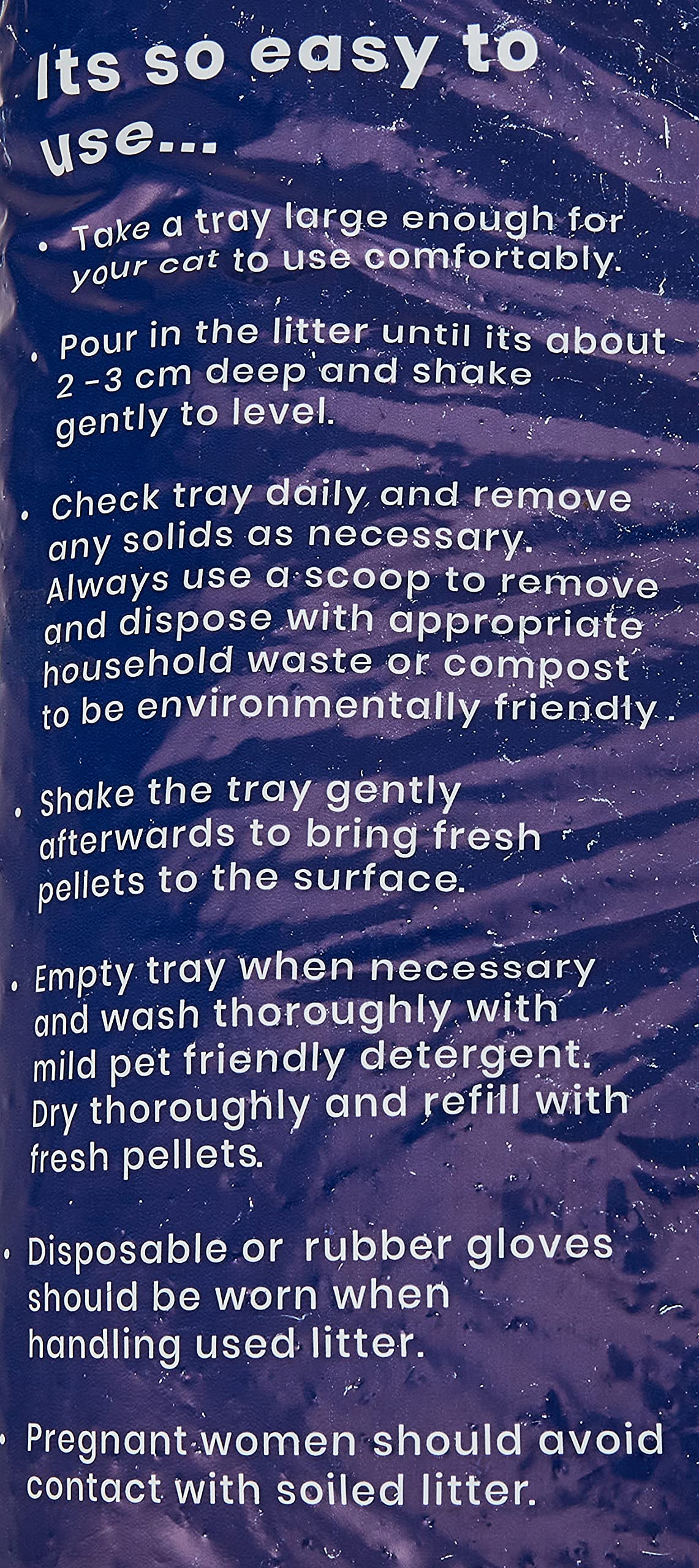 To use, pour Fresh Paws wood pellet cat litter into your cats tray until it’s 2-3 cm deep and shake until level. Check tray daily and remove any solids using a biodegradable poop bag and put into your non recyclable household waste. Approximately once a week empty the tray into old newspaper, wrap it up and bin it or place in your compost bin to be even more environmentally friendly. Wash the tray with a mild pet friendly detergent and dry thoroughly – refill with fresh wood pellets. Fresh Paws Wood Pellet Cat litter can also be used for all types of domestic spillage.