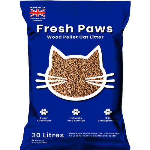 Fresh Paws Wood pellet cat litter is made from 100% British softwood. It has abosolutely no additives, glues, fragrances or chemicals added. Its 100% wood!. Pine has natural antibacterial properties so helps to kill germs. It also gives off a lovely fresh natural pine fragrance. Fresh Paws wood pellet cat litter is really easy to Use and dispose of, just shake the tray daily to bring fresh pellets to the surface and remove any gifts left by your pet. Dirty litter can be added to your regular household waste or to be even more environmentally friendly It makes for great compost as it is 100 percent biodegradable. The litter is super absorbent and will take up more than 3 times its own weight in liquid. Fresh Paws wood pellet cat litter can also be used for rabbits, poultry and reptiles. Available in the 5Ltr, 15Ltr and 30Ltr bags..