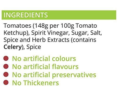 Tomatoes (148g per 100g Tomato Ketchup), Spirit Vinegar, Sugar, Salt, Spice and Herb Extracts (contain CELERY), Spice