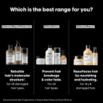 • Thanks to its formula enriched with peptides, the Absolut Repair Molecular Hair Rinse-Off Serum repairs hair damage by injecting the essential components directly into the fibre in order to rebuild the molecular structure of the hair and protect it from heat.