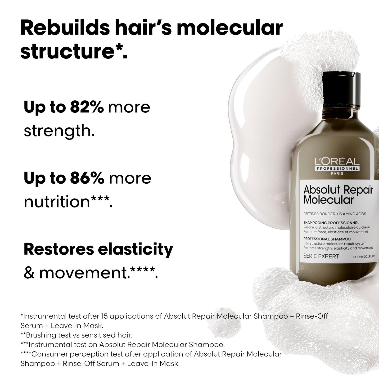 [SCIENTIFIC DISCOVERY – MOLECULAR REPAIR] When hair is damaged, its molecular structure, composed of peptides, is compromised. But most peptides are too big to be reinjected into the fibre, making damage almost irreversible. Scientific discovery – Absolut Repair Molecular. Help repair damage & restore original hair strength. Up to 82% more strength*. Restore hair’s original elasticity & movement**. For the first time, L’Oréal’s Advanced Research team successfully managed to decompose peptides, to inject their components separately into the fibre***. Once inside, they reform & rebuild the molecular structure of the hair****. [PATENTED TECHNOLOGY] This patented shampoo, formulated with Peptides bonder + 5 Amino acid, repairs hair macro-molecular structure*. Hair is stronger and nourished, with improved elasticity, movement*****, and +86% smoothness******. [PROFESSIONAL FORMULA] Sulfate-free, the formula’s luxurious texture turns into a rich foam, cleanses, detangles hair and delivers a high level of care. [RECOMMENDED FOR ALL DAMAGED HAIR] For all damaged hair textures, colour-treated, lightened & natural hair. [CO-DEVELOPED WITH REPAIR PROS] This range has been co-developed with 3 repair experts: Adina Pignatare @adina_pignatare from the US Mike Julliard @loungecut from France Barbara Rabelo @barbararabelo_ from Brazil *Brushing test vs sensitised hair. **Instrumental test after 5 applications of shampoo + rinse off serum. ***Amino acids & peptides bonder. ****Instrumental test after 15 applications of shampoo + rinse-off serum + leave-in mask. *****Consumer test after application of shampoo + rinse-off serum + leave-in mask.
