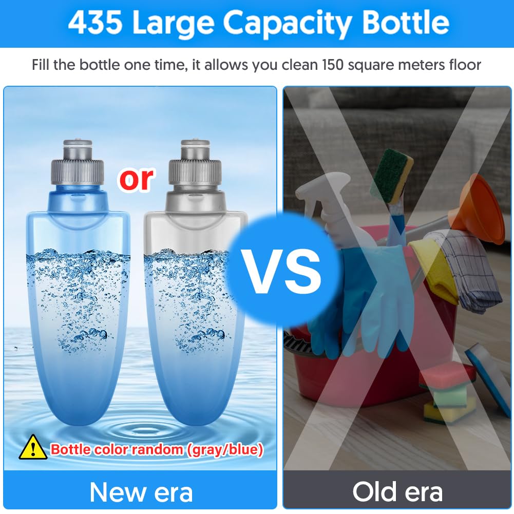 - [435ML Refillable Bottle] – High capacity refillable cleaning mop bottle can contains 435ml water. Meanwhile, you could fill it up with your favorite floor detergent, please remember to clean the water tank after finished the cleaning. Just fill the bottle one time, it allows you clean 100 square meters area, which you do not need to fill the cleaning solution multiple times during the cleaning process