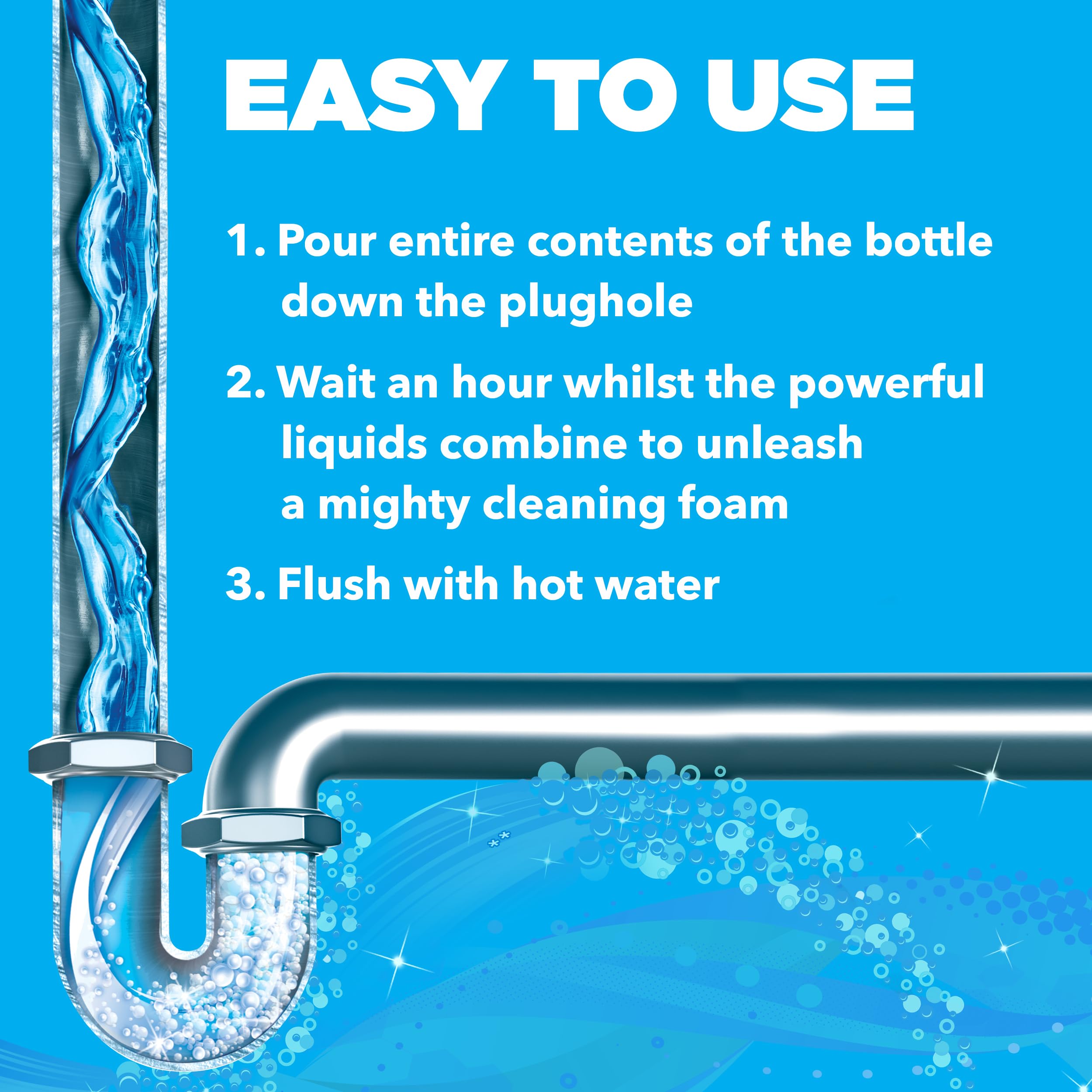 Mr Muscle Drain Foamer combines two powerful liquids to unleash a mighty cleaning foam that deep cleans pipes and eliminates odours in your drain . Its powerful formula works 10x better than baking soda and vinegar* as a drain pipe unblocker, removing foul gunge and hair from any pipe in your home. Simply pour the full bottle of liquid drain cleaner down the plughole, then wait an hour and flush hot water from the sink through your cleaned drain. With expanding foam that cleans and stops odours by filling the entire pipe wall, Mr Muscle Drain Foamer’s unstoppable drain power allows you to clean less and live more. *Based on hair removal in laboratory testing