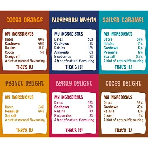 Cocoa Orange Ingredients: Dates 40%, CASHEWS 40%, Raisins 14%, Cocoa 5%, Orange oil, Natural flavouring. Blueberry Muffin Ingredients: Dates 58%, CASHEWS 15%, Raisins 15%, ALMONDS 10%, Blueberries 2, Natural flavouring. Salted Caramel Ingredients: Dates 54%, Raisins 21%, CASHEWS 12%, PEANUTS 12%, sea salt 0,4%, Natural flavouring. Peanut Delight Ingredients: Dates 53%, PEANUTS 46%, Sea salt, Natural flavouring. Berry Delight Ingredients: Dates 49%, CASHEWS 30%, Raisins 17%, Raspberries 3%, Natural flavouring. Cocoa Delight Ingredients: Dates 48%,CASHEWS 30%, Raisins 16%, Cocoa 6%, Natural flavouring.