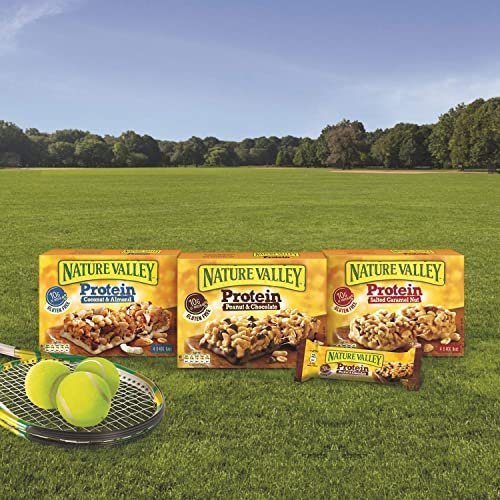 Nature Valley protein cereal bar, ideal for on-the-go snacks or a post workout treat. High in protein, high in fibre, gluten free. Containing 20 Percent of your daily protein needs. Great tasting bars with no artificial flavours, colours or preservatives. Suitable for vegetarians. Carefully selected ingredients.