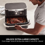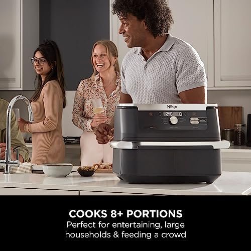 Details: Introducing Ninja Foodi FlexDrawer, the extra-large capacity air fryer that adapts to fit every meal. Instantly transform from a double air fryer to a single air fryer. Two independent cooking zones cook 2 foods, 2 ways –Dual Zone Technology lets you cook with different functions, times and temperatures in each zone, both finish cooking at the same time! Remove the divider to expand your menu with the 10.4L MegaZone, fitting a whole leg of lamb with roast vegetables, traybake meals and more. Quickly create delicious family-size meals for 8+ people, up to 75% faster than fan ovens*. Air Fry using little to no oil – up to 75% less fat than traditional frying methods**. More than an air fryer, you can Air Fry, Max Crisp, Roast, Bake, Reheat, Dehydrate and Prove. Easy to use with one-touch controls. The 10.4L drawer, divider and 2x crisper plates are all non-stick and dishwasher safe for easy cleaning. Get started immediately with the included Chef-created recipe guide. Make yours a Ninja Kitchen. *Tested against sausages and fish fingers. **Tested against deep-fried, hand-cut French fries.