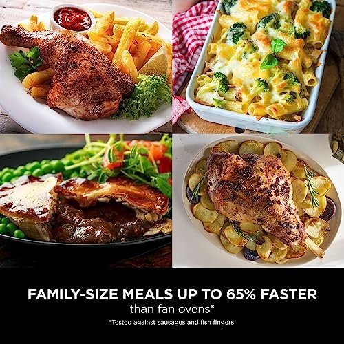 • 7 COOKING FUNCTIONS: Air Fry, Max Crisp, Roast, Bake, Reheat, Dehydrate, Prove. Quick family meals up to 65% faster than fan ovens* (*Tested against fish fingers and sausages, including preheat)