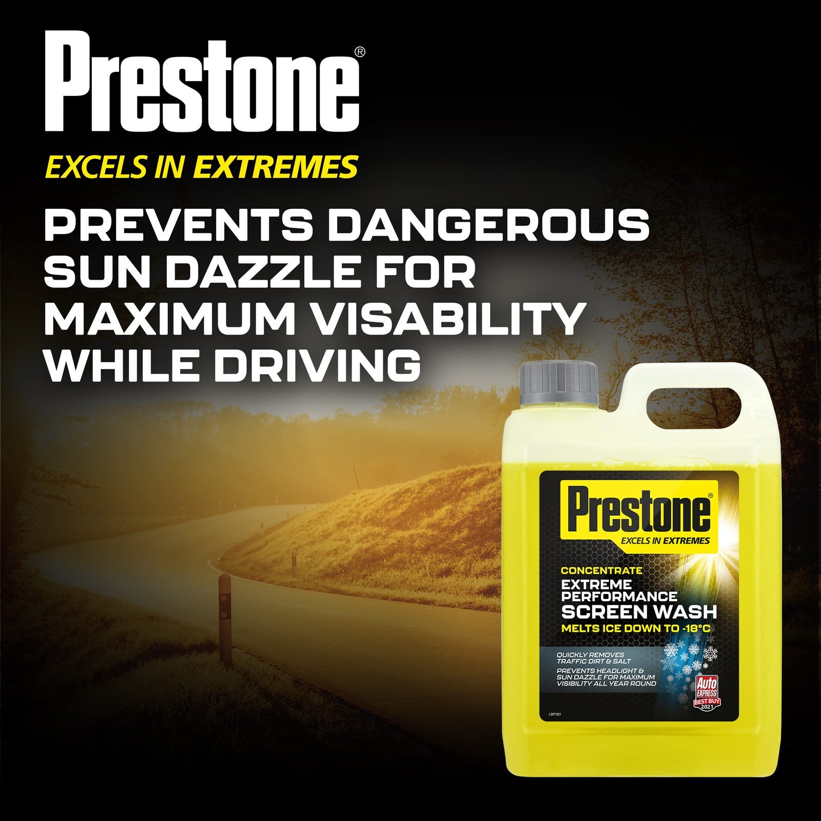- SCREENWASH CONCENTRATE: Introducing Prestone Extreme Performance Screen Wash, a super-concentrated windscreen washer fluid that’s tough enough to tackle driving conditions all year round – it’ll make light work of whatever the weather sends your way.
