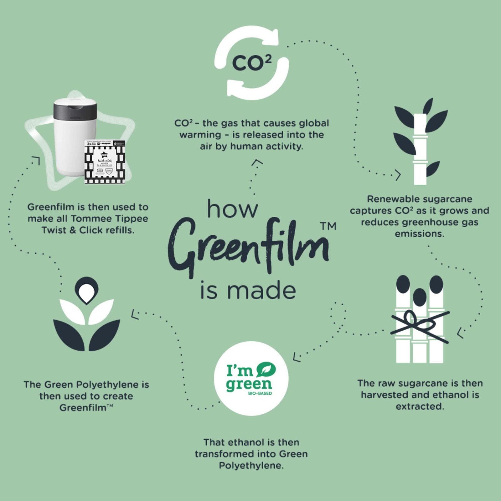 - Now more eco-friendly: Twist & Click nappy bins and refill chassis are made from 98% recycled and fully recyclable plastic and now includes antibacterial, sustainably sourced sugarcane GREENFILM