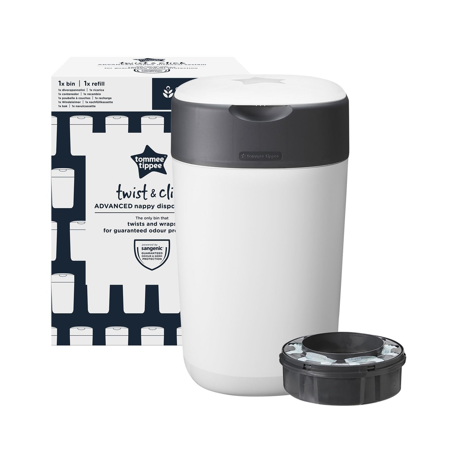 Tommee Tippee Twist and Click Advanced Nappy Bin, Eco-Friendlier System, Includes 1x Refill Cassette with Sustainably Sourced Antibacterial GREENFILM, White